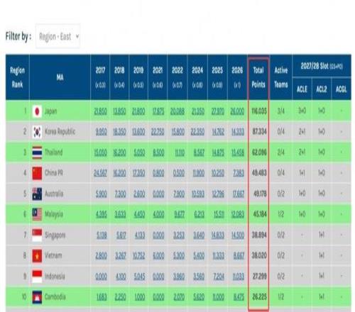 中超或無(wú)緣亞冠精英聯(lián)賽!亞冠技術(shù)分被柬埔寨超越,僅排東亞第10