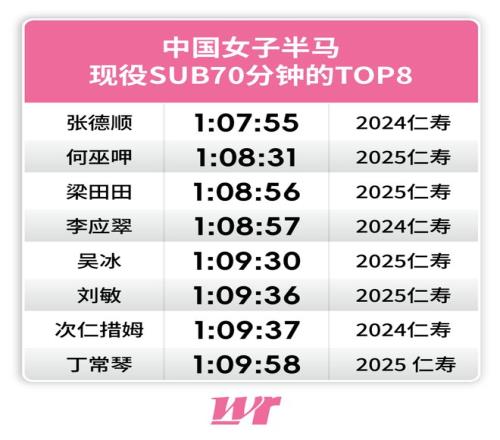 目前,國內(nèi)女子半馬打開70分大關(guān)的選手共有8位,此番仁壽,榜單上的一半女將都將聚首仁壽。
