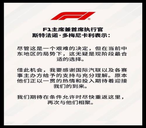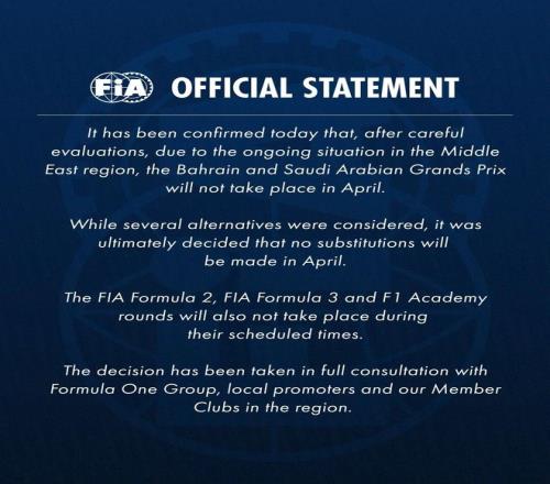 就在今天上午,F(xiàn)1官方確認了本賽季巴林和沙特阿拉伯大獎賽將不會在四月進行。官方聲明中表示,由于受中東地區(qū)當前局勢影響,原定的F1連同F(xiàn)2、F3和F1學(xué)院賽事將不會如期舉行。盡管考慮了其他備選方案,但四月將不會安排替代賽事。
