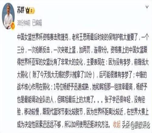 女籃險勝捷克引熱議!蘇群:張子宇與現(xiàn)代籃球脫軌很難再有李夢了