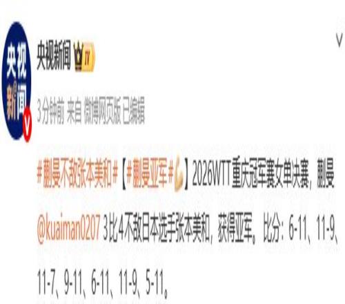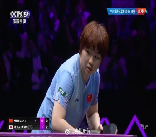 據(jù)央視新聞微博消息,2026WTT重慶冠軍賽女單決賽,蒯曼3比4不敵日本選手張本美和,獲得亞軍。 比分:6-11、11-9、11-7、9-11、6-11、11-9、5-11。