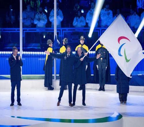 閉幕式中國體育代表團旗手為殘奧越野滑雪和冬季兩項男運動員蔡佳云、輪椅冰壺女運動員王蒙。