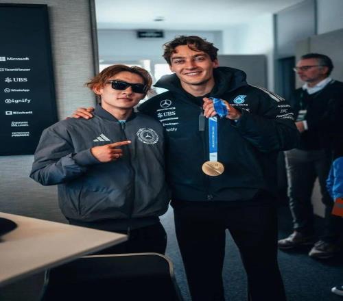 蘇翊鳴來F1是有任務(wù)的,他在現(xiàn)場需要擔(dān)任正賽揮旗嘉賓的工作,很有含金量了。賽后他還和同為阿迪達(dá)斯代言人的梅奔F1車隊車手喬治·拉賽爾合影,“拉姐”拿著小蘇的冬奧金牌不撒手,夢幻聯(lián)動了。