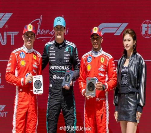 吳艷妮不僅來了,還頒獎了。她作為嘉賓,給沖刺賽的前三名拉塞爾、勒克萊爾、漢密爾頓頒獎。