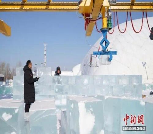 2月3日,在第二十七屆哈爾濱冰雪大世界的“科技賦能冰雪實(shí)驗(yàn)區(qū)”內(nèi),智能自動(dòng)化標(biāo)準(zhǔn)冰砌塊生產(chǎn)線已初步形成,從冰塊切割塑型到自動(dòng)搭建均進(jìn)入現(xiàn)場(chǎng)測(cè)試階段。中新社發(fā) 趙宇航 攝