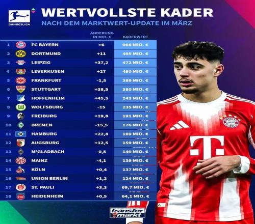 德轉(zhuǎn)更新德甲俱樂部身價榜: