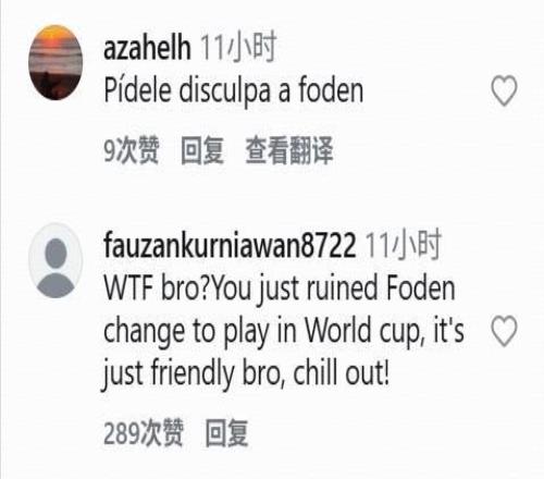 “搞什么。你剛毀掉了福登踢世界杯的機(jī)會,這只是友誼賽,冷靜!(注:他誤打成了‘改變’change,賽后門將特拉福德稱,福登沒有大問題。)”