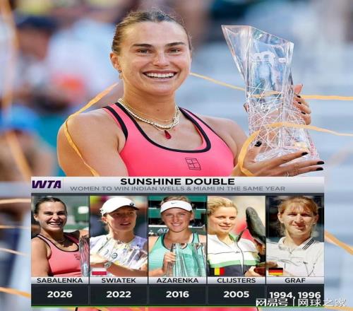 當薩巴倫卡在邁阿密硬地賽場舉起冠軍獎杯的那一刻,她對本賽季春季北美賽場完成了完美征服——背靠背拿下印第安維爾斯和邁阿密兩站W(wǎng)TA1000級別賽事,成為女子網(wǎng)壇歷史上第五位達成“陽光雙冠”的球員。這一成就的分量,在她年初澳網(wǎng)失利的背景下顯得尤為珍貴。然而,圍繞陽光雙冠與大滿貫孰難孰易的討論,也因此再度被點燃。