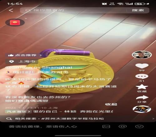 上周六,中國(guó)10K上海靜安站的賽道上,西蒙沖過終點(diǎn)后沒有急著看成績(jī),而是掏出手機(jī)對(duì)著獎(jiǎng)牌拍了張照,順手發(fā)了一條抖音:“10公里跑得很爽,算是給半馬熱了熱身。有沒有朋友也去跑太湖賽道的?咱們偶遇呀。”