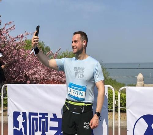 人群里,有個(gè)身影格外醒目,他掏出手機(jī),背對(duì)著太湖拍了張自拍,你或許已經(jīng)認(rèn)出來,這是西蒙(Simon)——那個(gè)上周在上海靜安跑完10公里后,發(fā)視頻約跑友“太湖見”的丹麥人。